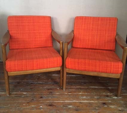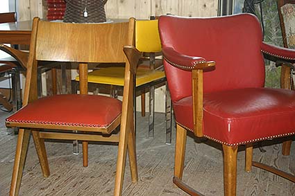 Rote Sessel aus den 50er-Jahren, beide mit Kunstleder bespannt |