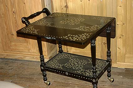 Servierwagen schwarz mit Perlmutteinlagen, seitlich auf beiden Seiten aufklappbar |